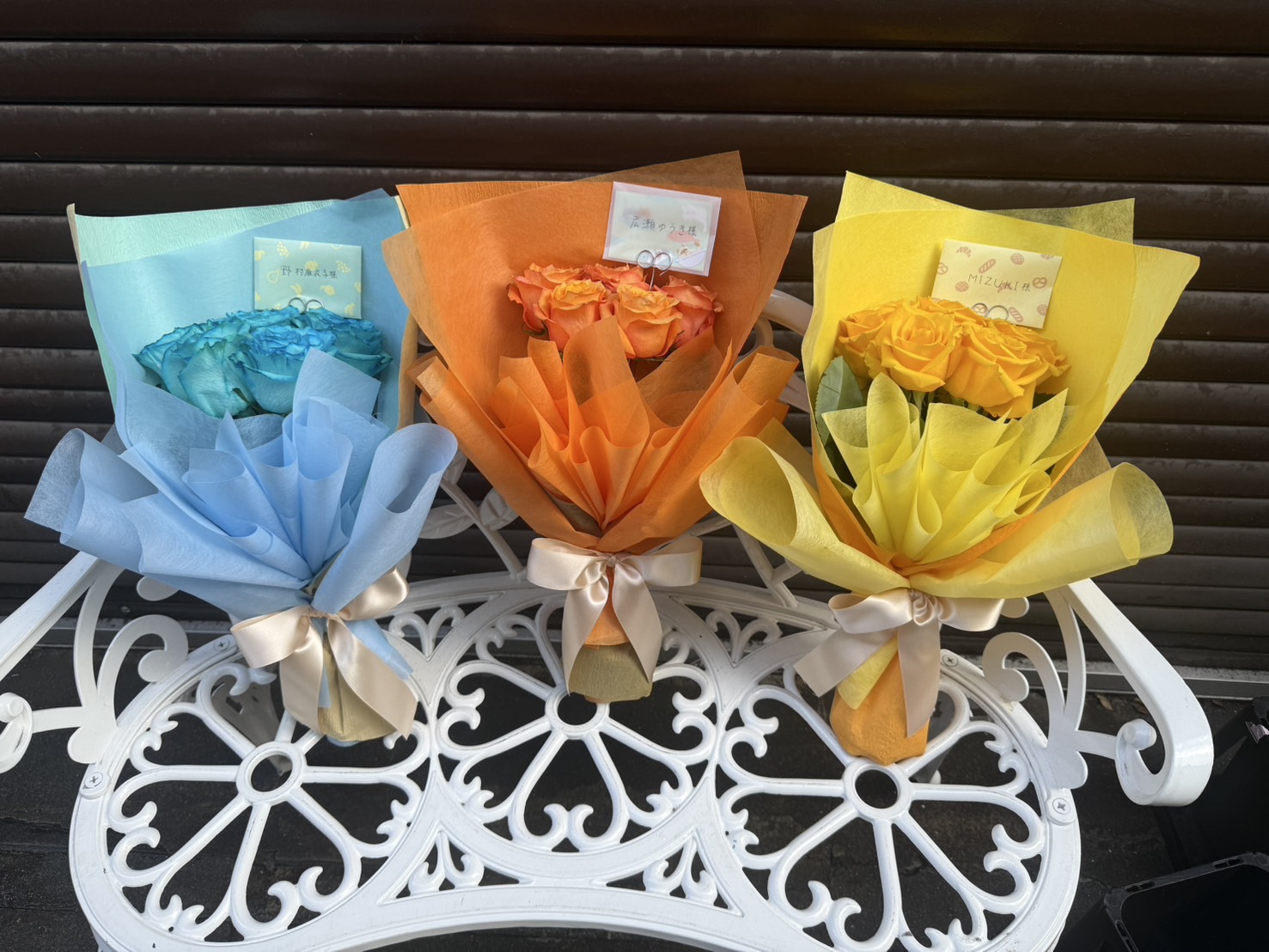 Lonesome_Blue3周年ライブを彩る、鮮やかな青、黄、オレンジ色の花束。ライブの成功を祝う華やかな雰囲気です。