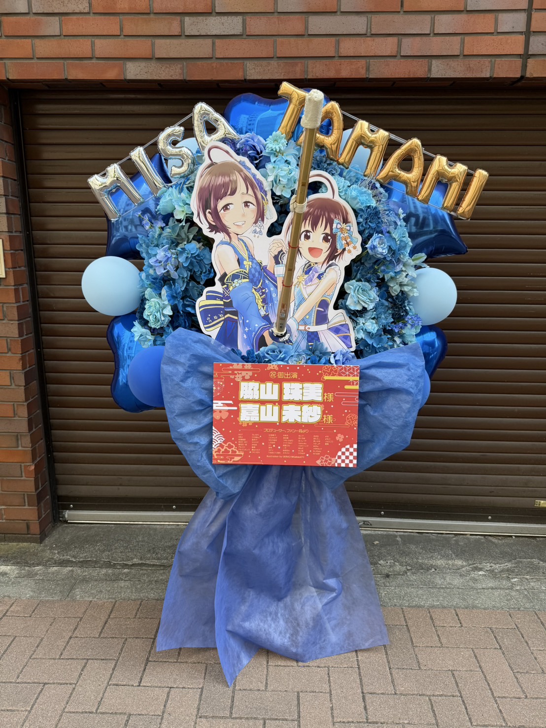 青を基調とした爽やかなフラスタ。アイドルのパネルとバルーンで華やかに飾られ、祝福ムード満点です。