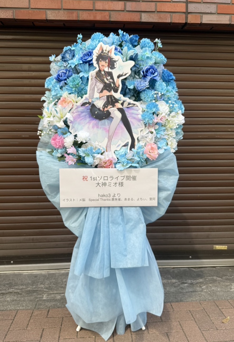 大神ミオさんの1stソロライブを祝う、青と白を基調とした爽やかなフラスタ。上品な花々と中央のパネルがライブを華やかに彩ります。