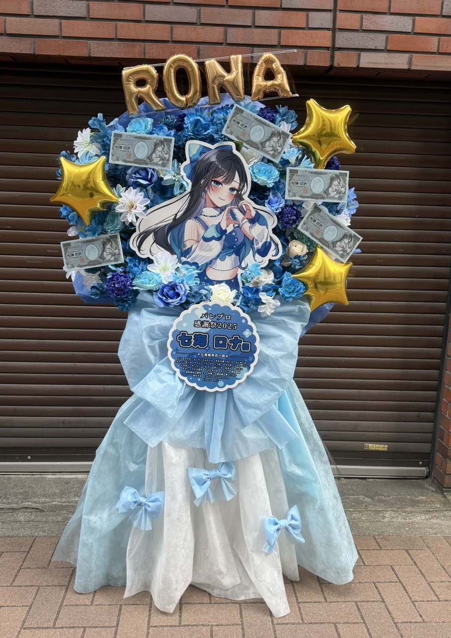 青と白を基調とした、七星ロナさんへの感謝祭フラスタ。ゴールドのバルーンが華やかに彩りを添える、可憐で美しいデザインです。