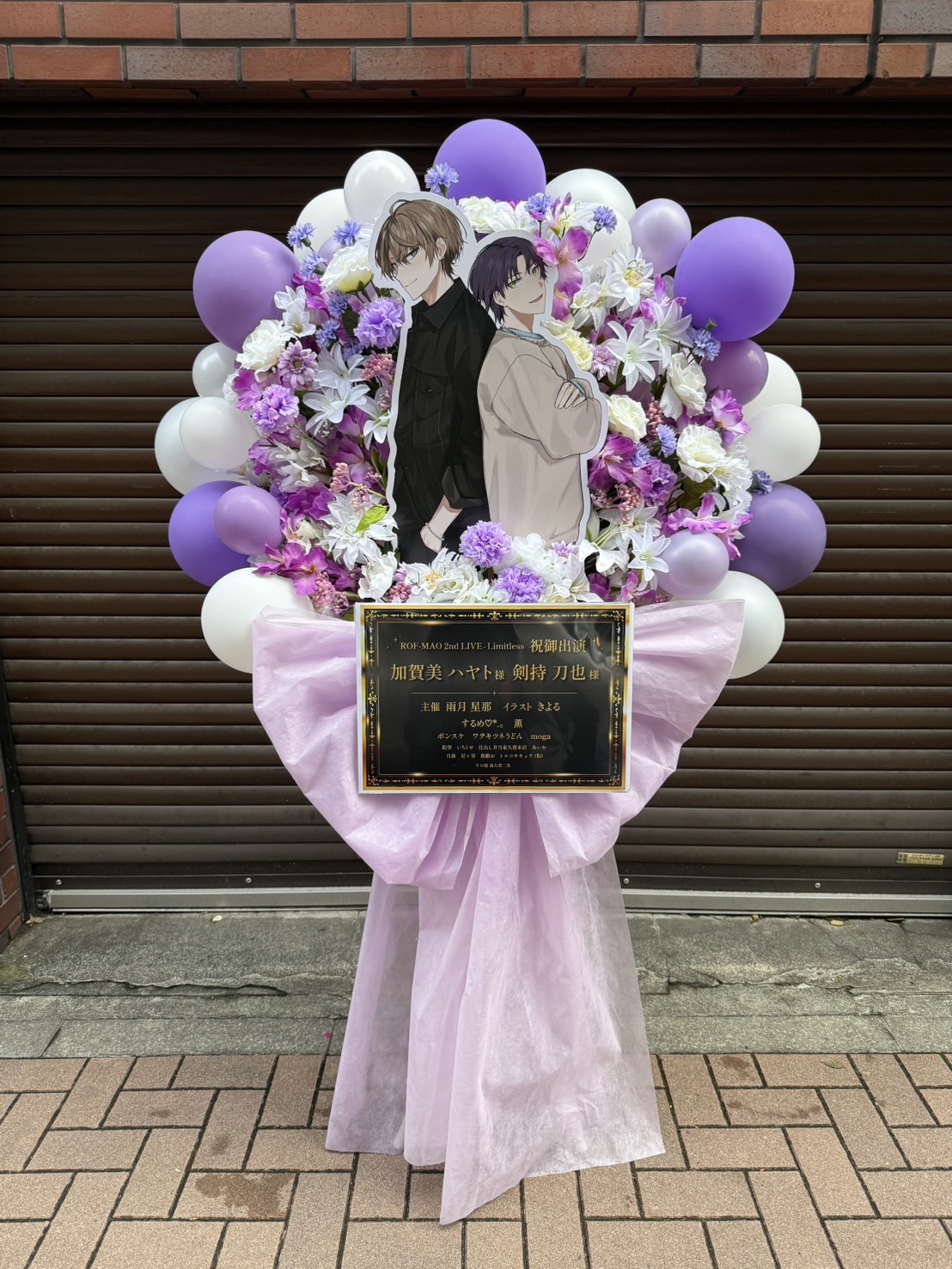 紫と白を基調とした、バルーンと生花が華やかなフラスタ。クールなキャラクターパネルが目を引きます。