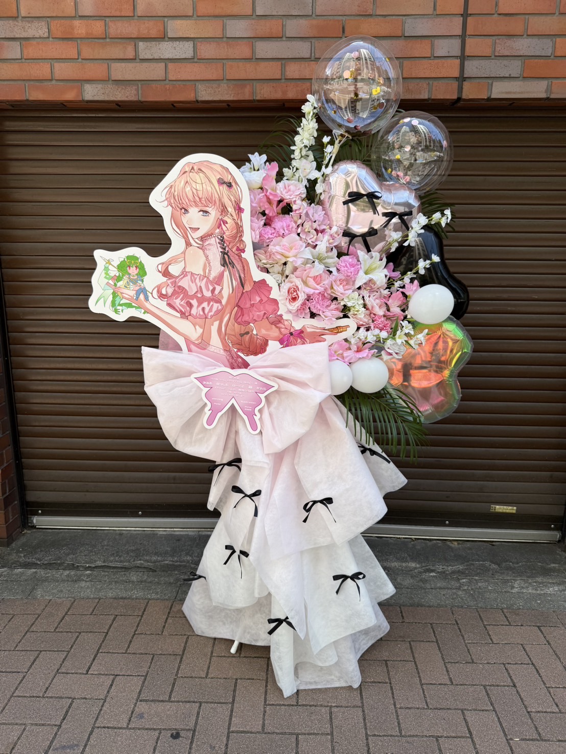 ピンクと白を基調とした華やかなフラスタ。バルーンとキャラクターパネルが会場を彩り、可憐な雰囲気を演出しています。