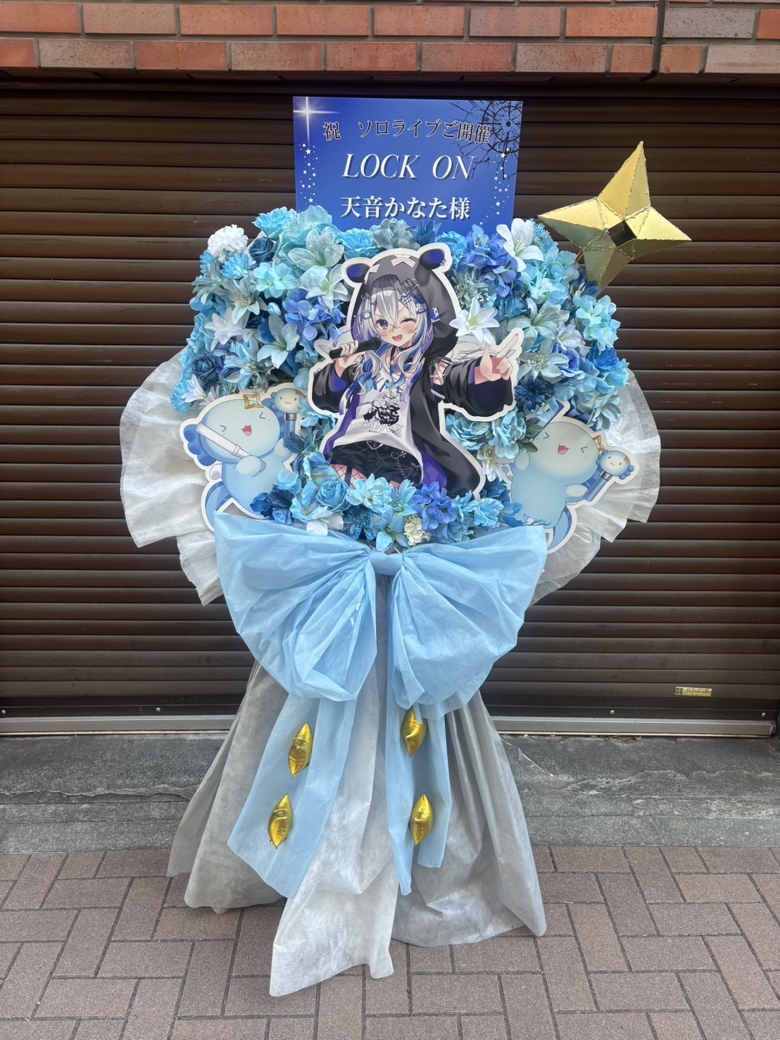 青と水色の花々で彩られたフラワースタンド。きらめく星飾りとキャラクターパネルがライブの華やかさを表現。天音かなた様のソロライブ成功を祝う爽やかなデザインです。