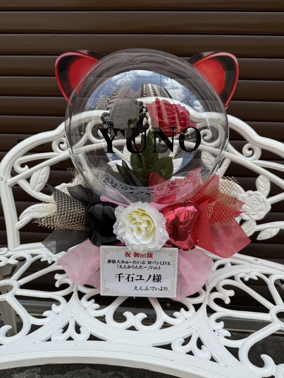 赤と黒を基調とし、透明バルーンとリボンで飾られたフラスタ。猫耳とYUNOの文字がキュートながらもクールな雰囲気を演出しています。