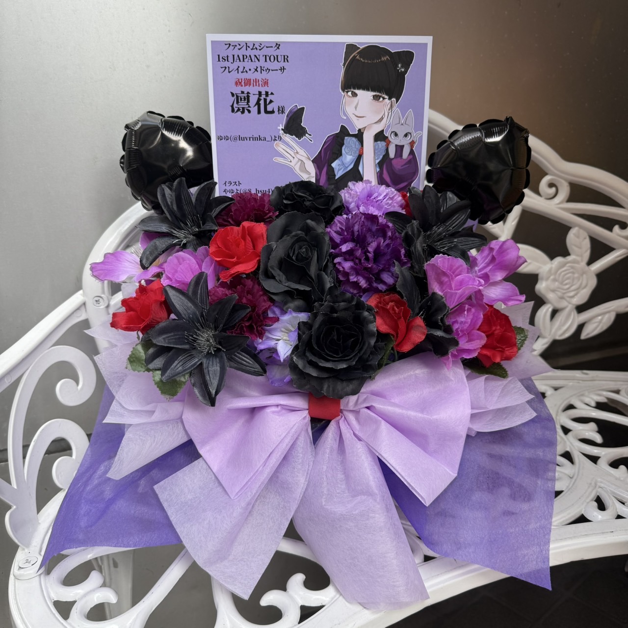 クールな紫、黒、赤を基調とした、大人っぽい雰囲気のフラスタ。キャラクターパネルとバルーンがアクセント。