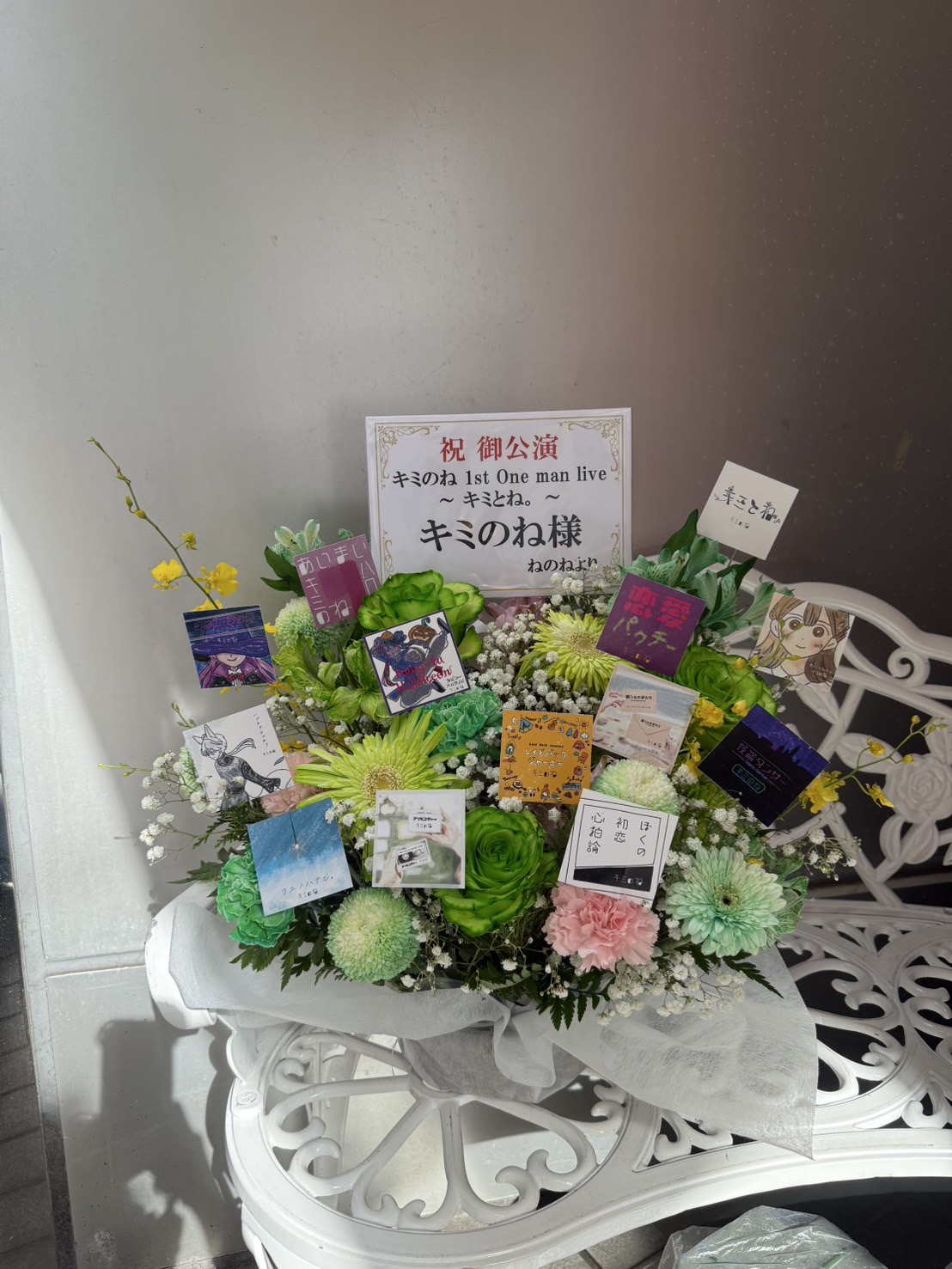 キミのね様の1stワンマンライブを祝う、緑と白を基調とした爽やかな生花フラスタ。可愛いイラストパネルが彩りを添えます。