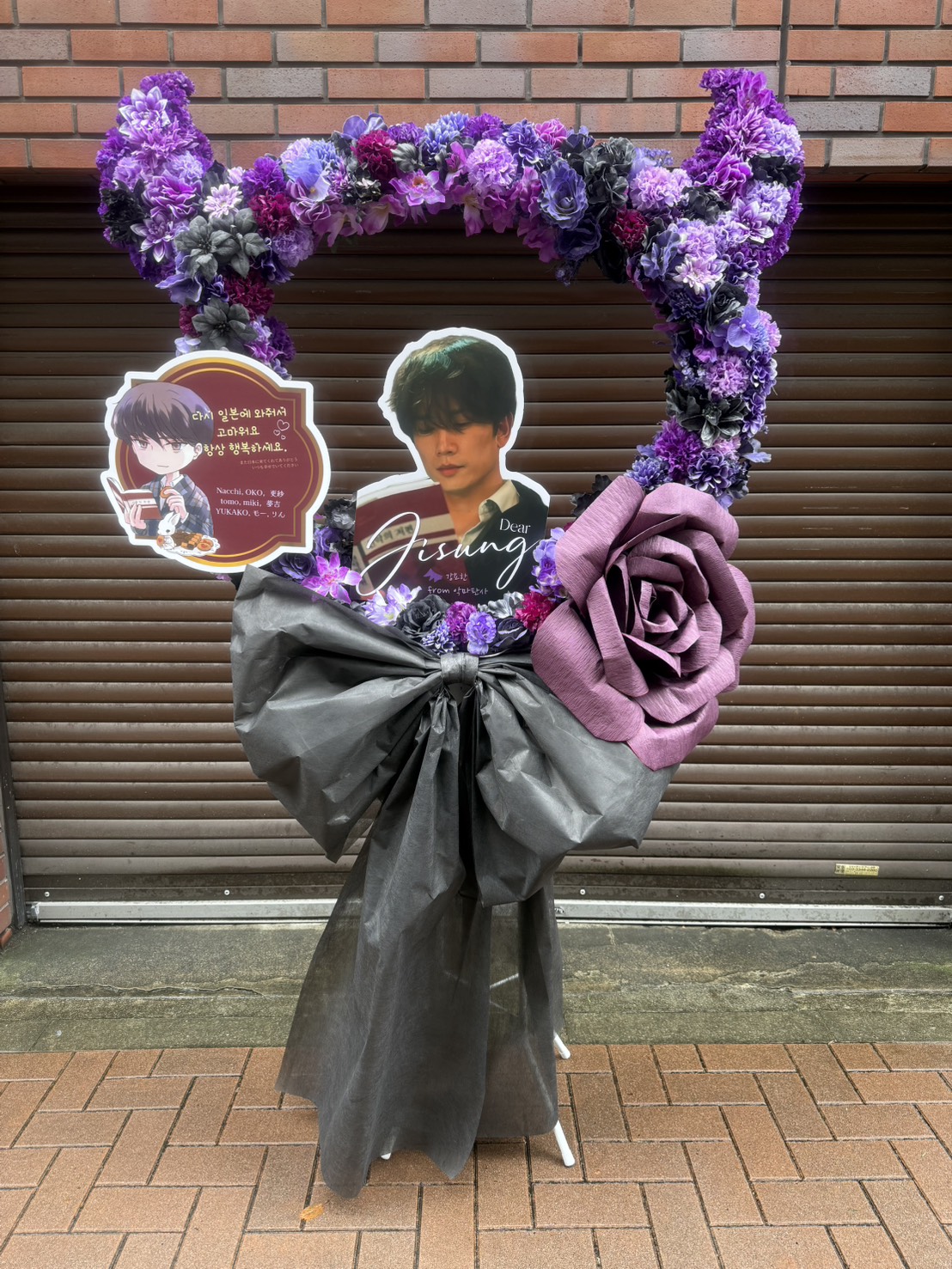 紫と黒を基調としたシックで華やかなフラスタ。ハート型の装花が印象的で、JISUNGさんへの愛が伝わります。