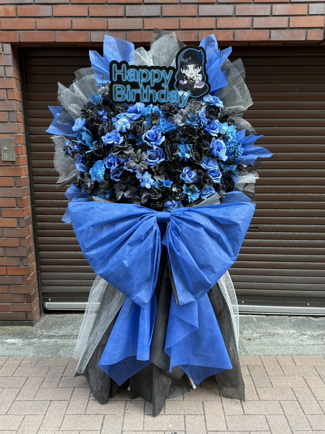 犬神ユウ生誕祭を祝う、青と黒が印象的なフラスタ。クールな色合いの中にキャラクターパネルが可愛らしく映えるデザインです。