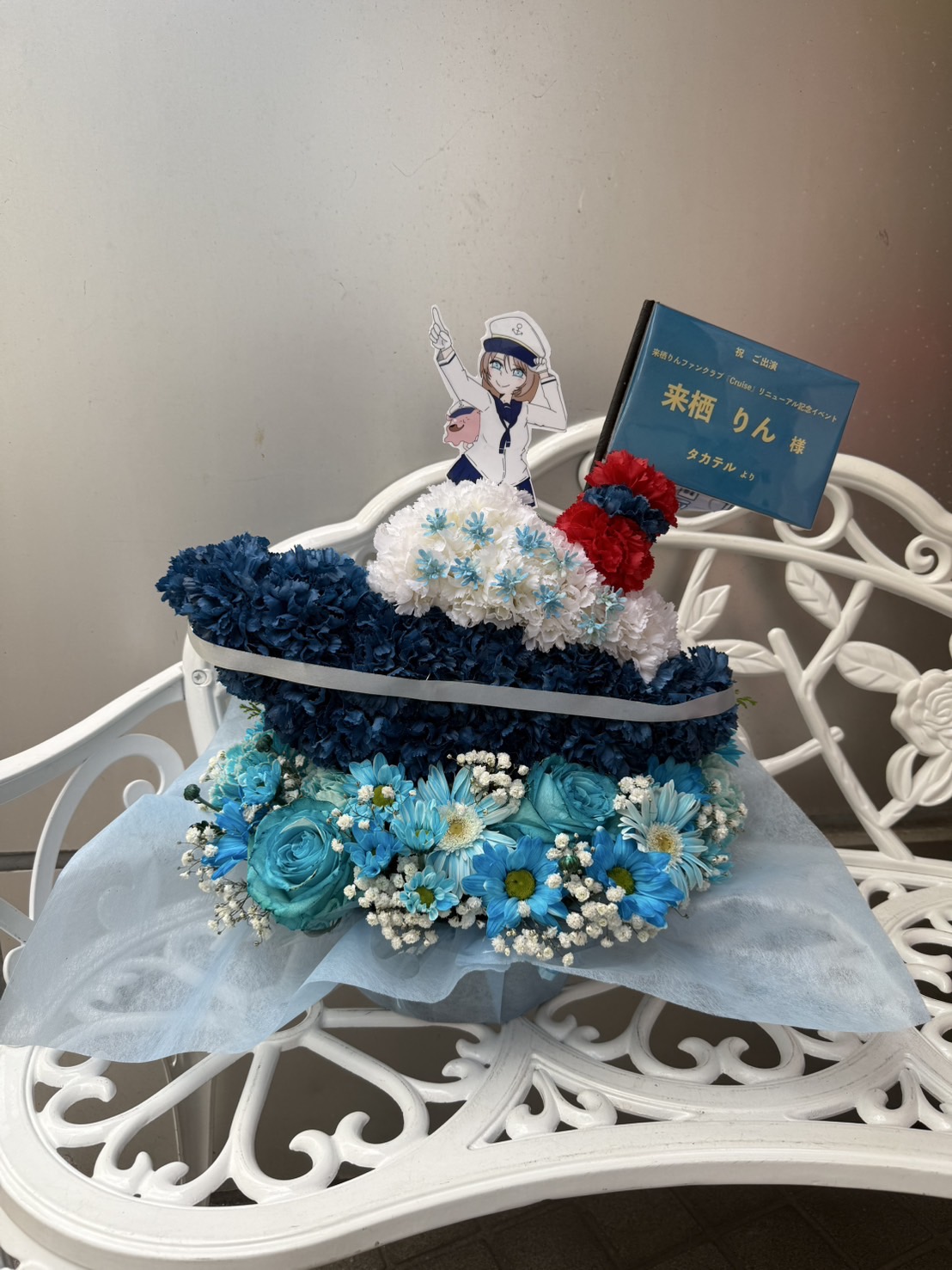 船の形をしたフラスタで、青と白を基調とした爽やかなマリンスタイル。来栖りんさんのファンクラブリニューアルをお祝いする素敵なデザインです。