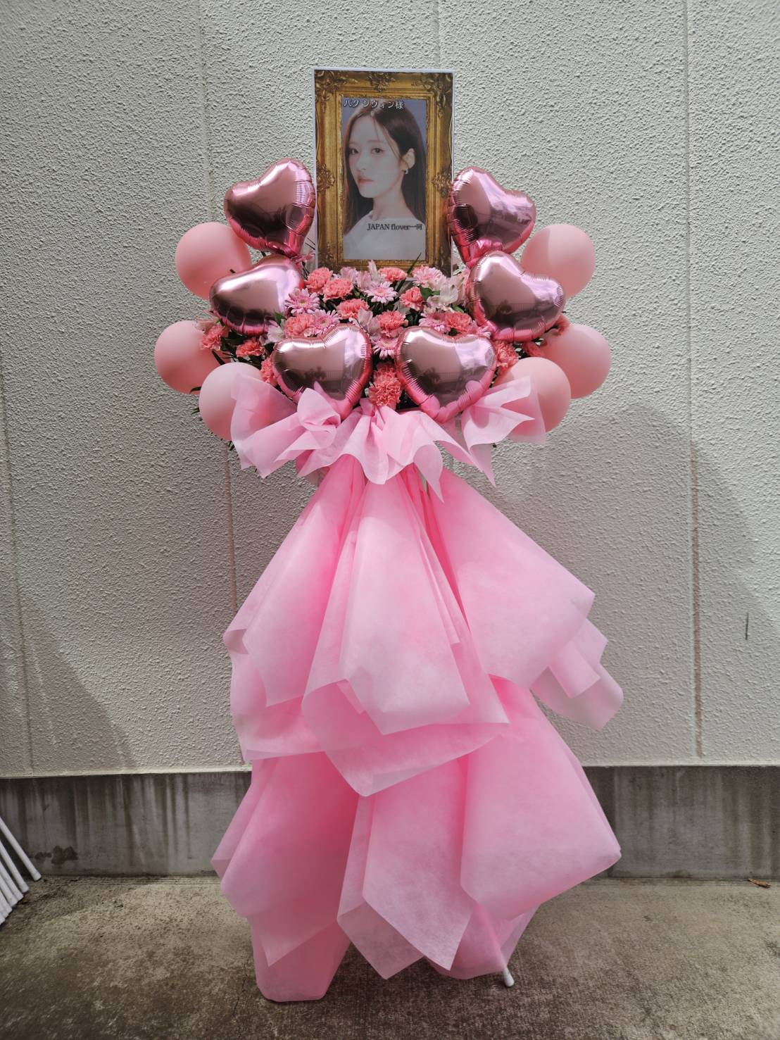 fromis_9のステージを彩る、ピンクとローズゴールドが可愛らしいフラスタ。生花とバルーンで華やかに飾られました。