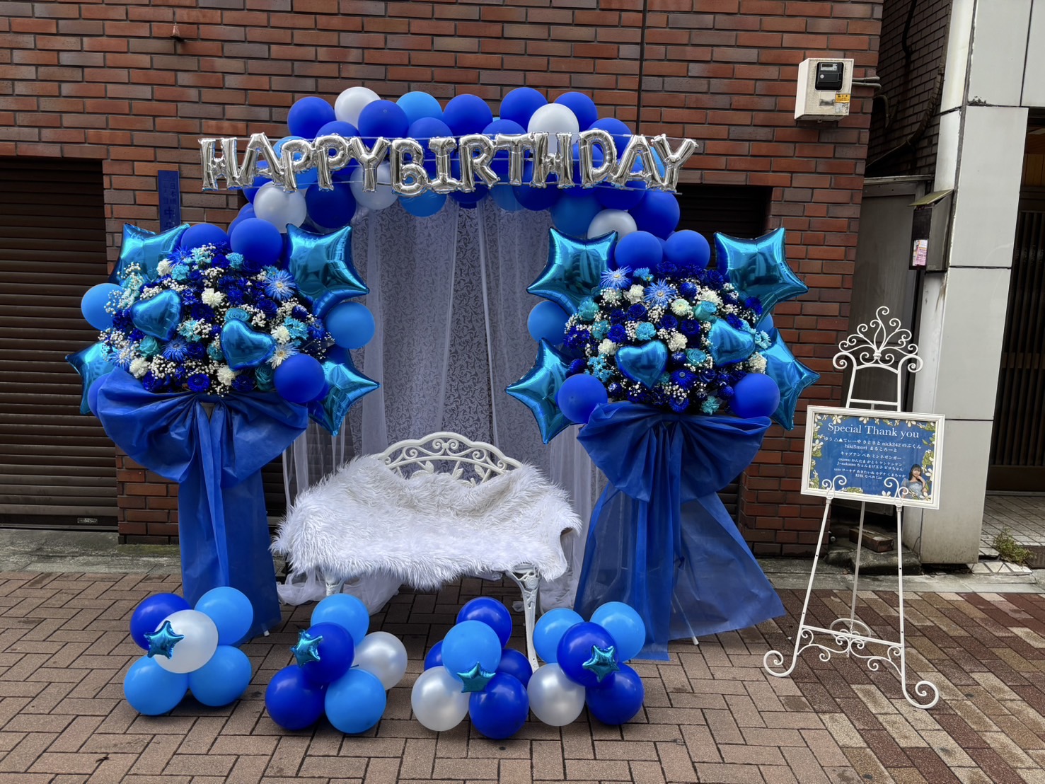 凪沙茉莉果生誕祭を祝う、青と白を基調とした豪華な連結フラスタ。生花とバルーンが織りなす華やかさと、中央のベンチが可愛い撮影スポットに。