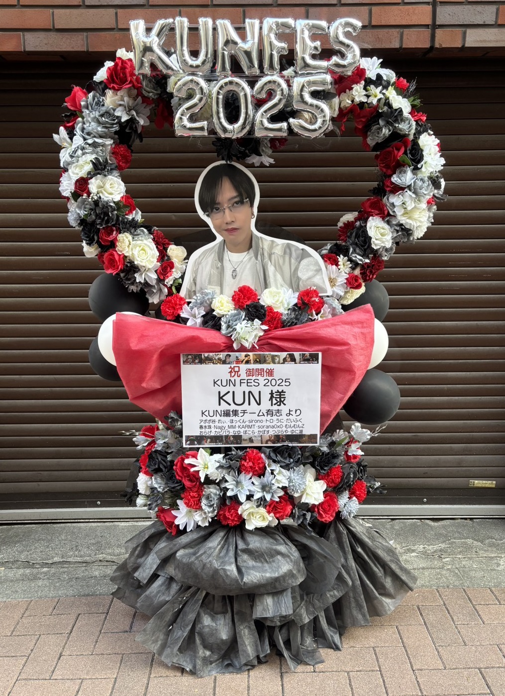 赤、黒、白を基調としたクールで情熱的なフラスタ。KUNさんのパネルが映える豪華なデザインです。
