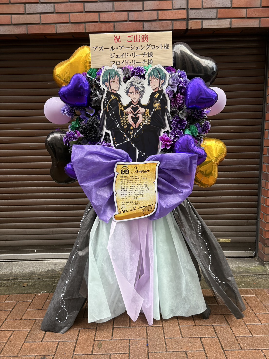 パープルとブラックを基調とした、ツイステの世界観溢れるフラスタ。キャラクターパネルとバルーンが華やかさを演出。