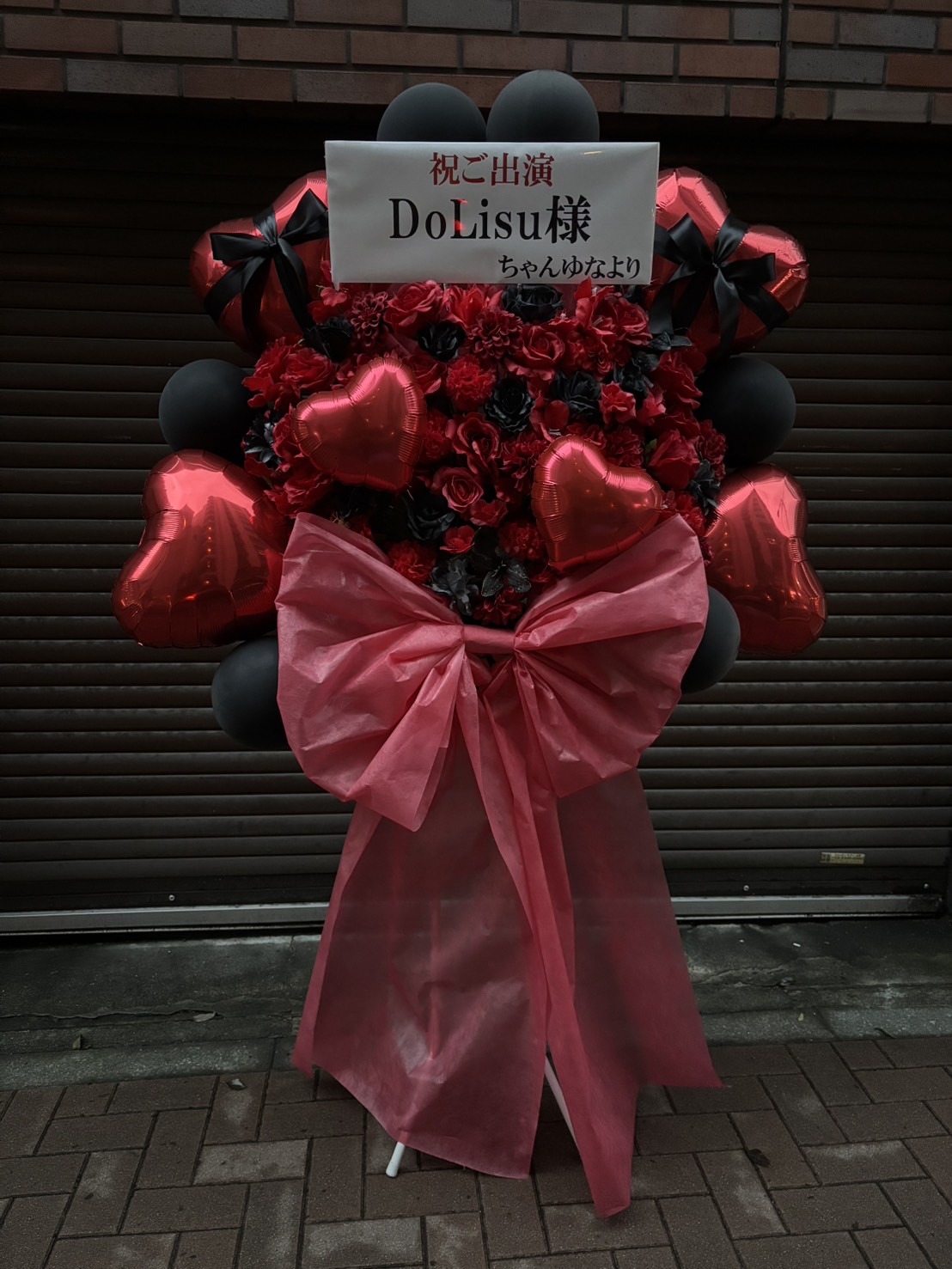 「もしうさのイタズラ電話 対決!」へ贈られた、赤と黒が情熱的なフラスタ。ハートバルーンとバラがゴージャスさを演出し、大きなピンクのリボンが華やかさを添えています。