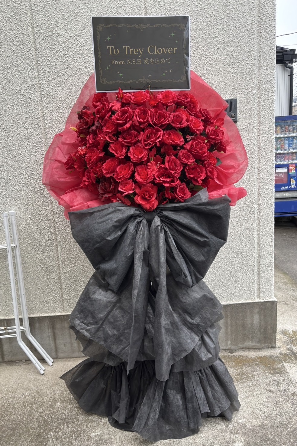情熱的な真っ赤なバラとシックな黒のフリルが印象的な、大人っぽい雰囲気のフラスタ。
