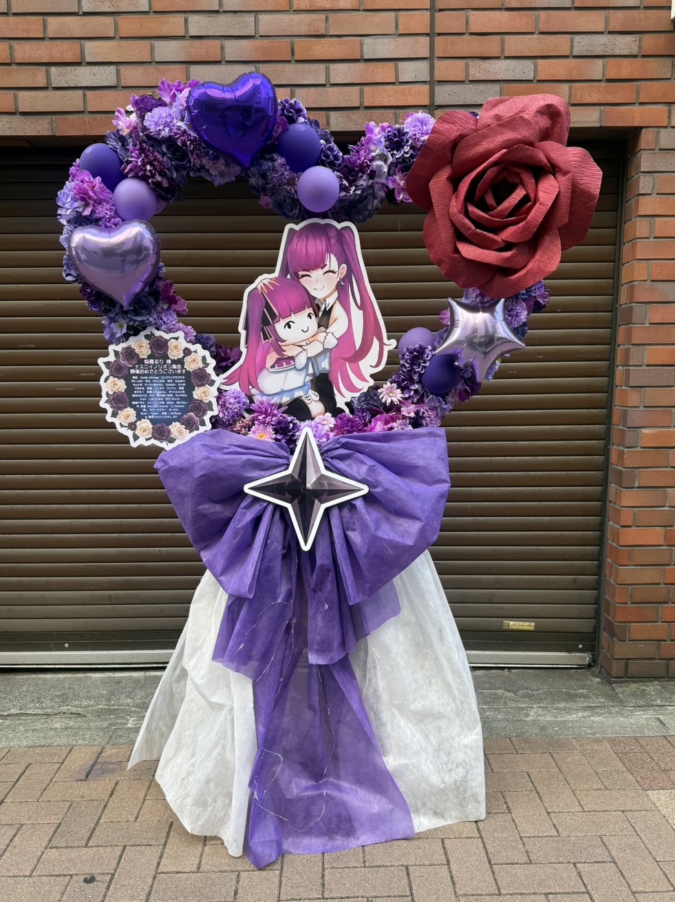 紫を基調に赤のアクセントが映えるフラスタ。愛らしいキャラクターのパネルがイベントを華やかに彩ります。
