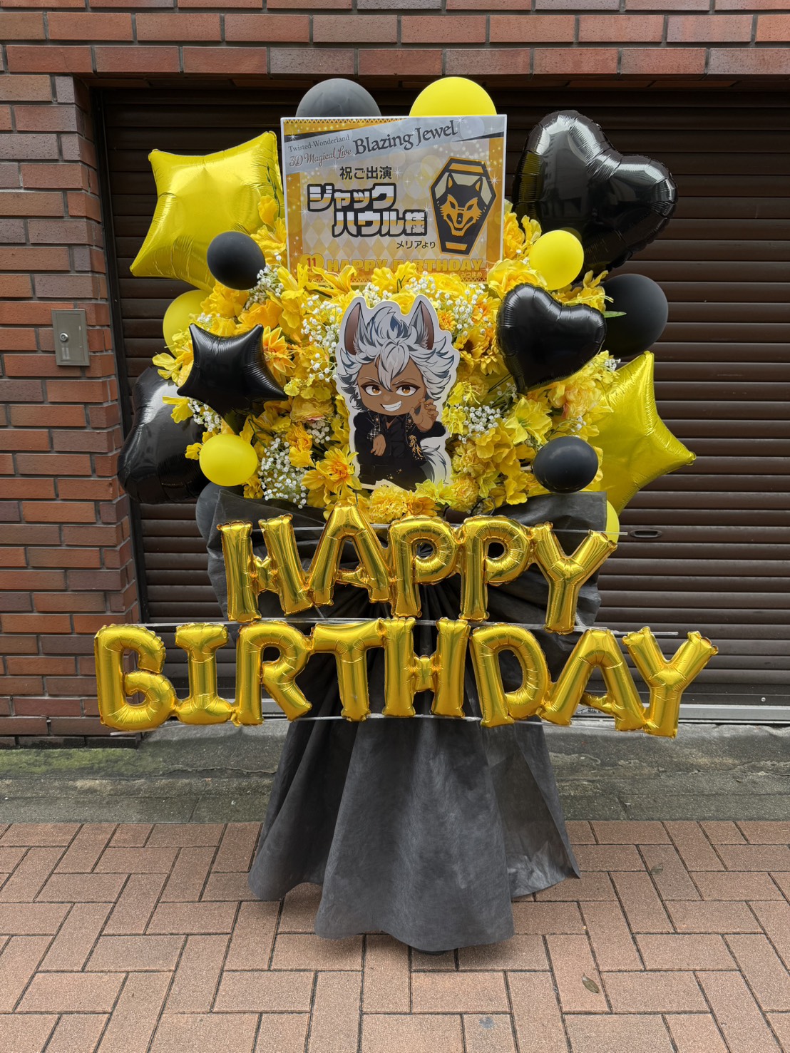 黄色と黒のコントラストがクールで目を引くフラスタ。バルーンと生花でジャック・ハウル様の出演と誕生日を華やかに祝福。