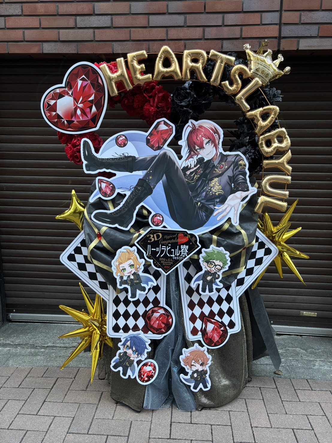 赤と黒を基調に、金色の装飾でハーツラビュル寮の世界観を表現。リドルを中心に豪華なフラスタです。