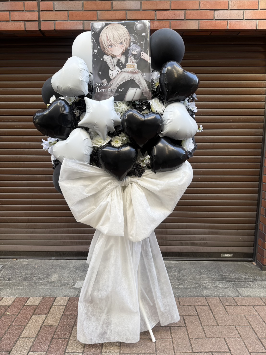 黒と白で統一されたモノトーンカラーがシックな生誕祭フラスタ。バルーンとパネルで華やかに、特別な一日を祝福します。