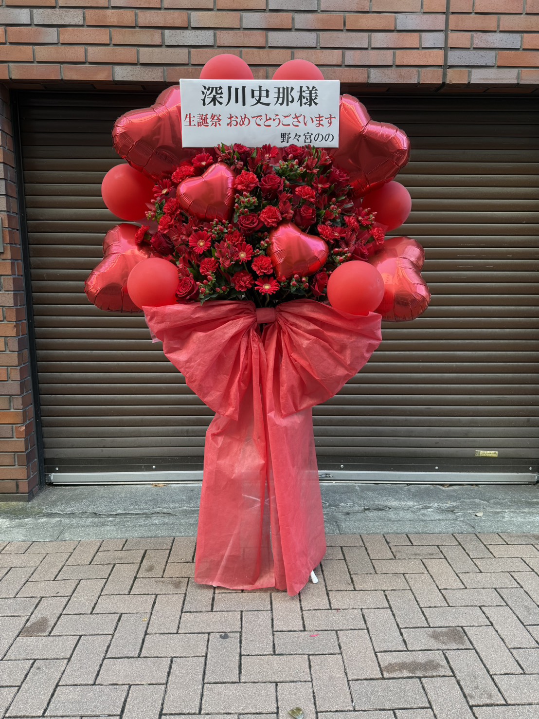 深紅のバラとハートバルーンが情熱的なフラスタ。深川史那様の生誕祭を華やかに彩る、愛に満ちたデザインです。