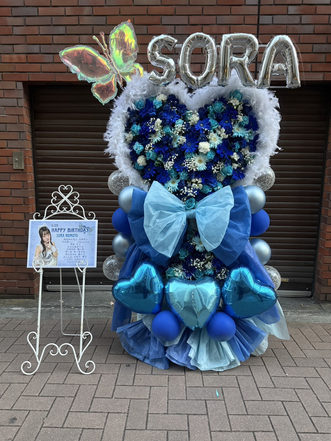 野元空生誕祭(仮)をお祝いする、青と白が基調の爽やかで華やかなフラスタ。ハート型の生花とバルーンが可愛らしい雰囲気を演出しています。