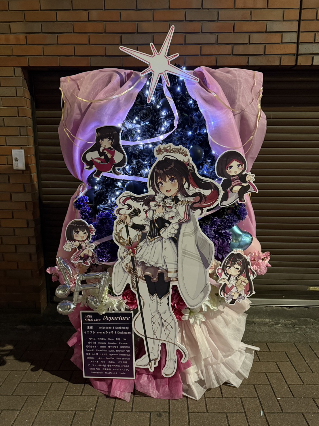 AZKi SOLO LiVE "Departure"を彩るフラスタ。ピンクと紫を基調に、きらめくLEDとキャラクターパネルで華やかに飾られ、出発への期待感を表現しています。