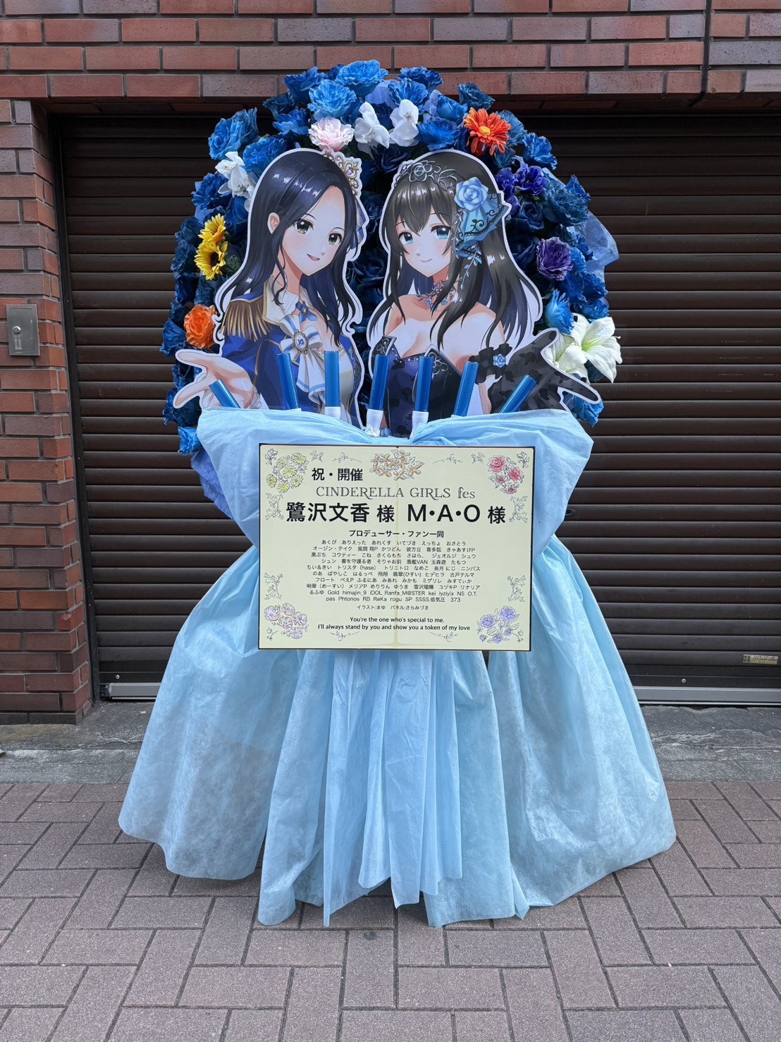 青を基調としたエレガントなフラスタ。キャラクターパネルが華やかに彩り、イベントへの祝福を表現しています。
