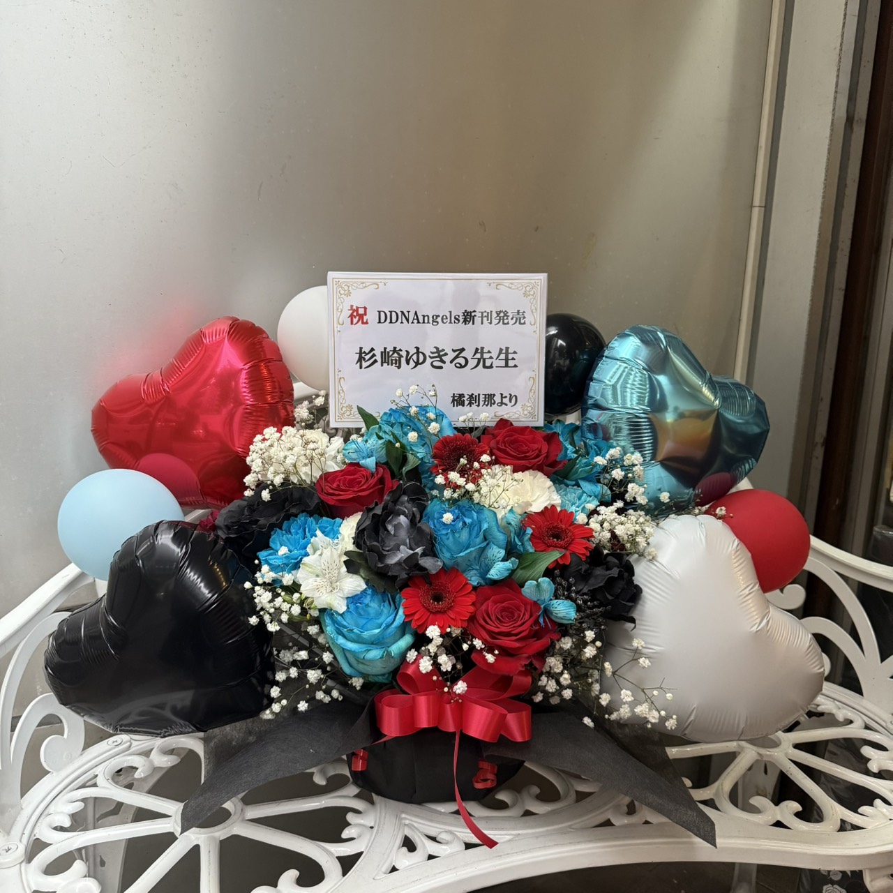 DDNAngels新刊発売を祝うフラスタ。赤、青、黒を基調としたクールで情熱的な花とバルーンが華やかに彩ります。
