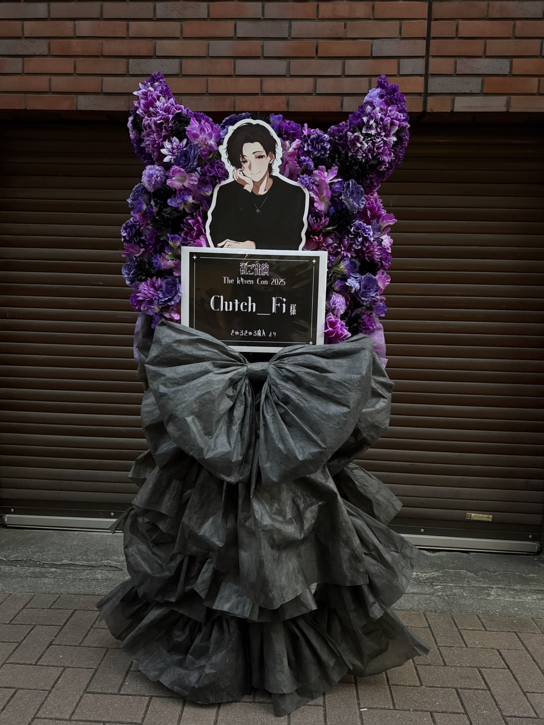紫の花とシックな黒の装飾が印象的なフラスタ。キャラクターパネルがイベントを盛り上げます。