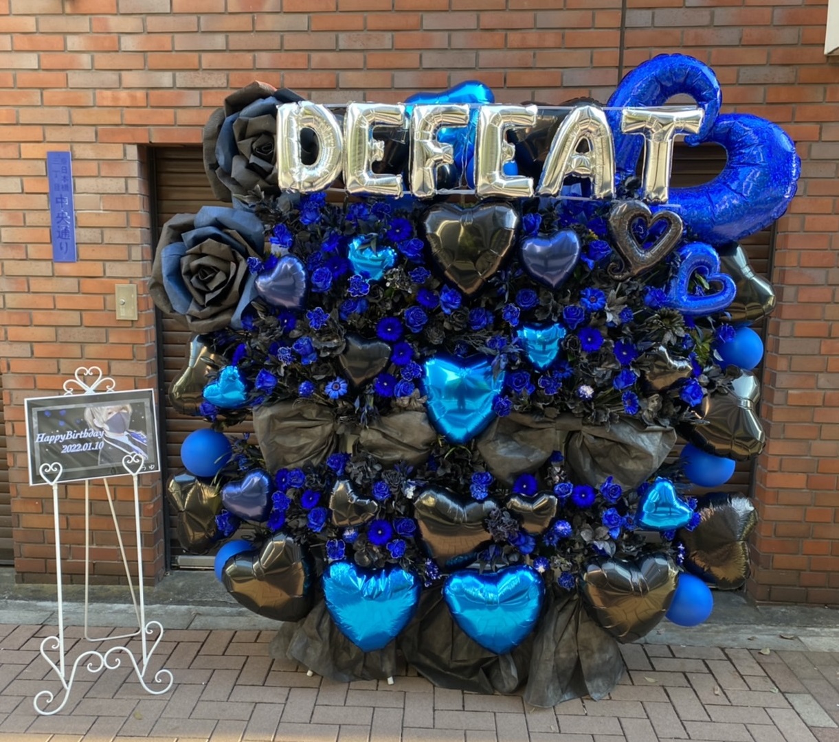 「でぃふぇあ生誕祭」を彩る、青と黒を基調としたクールで華やかなフラスタ。ハートバルーンがアクセントになっています。