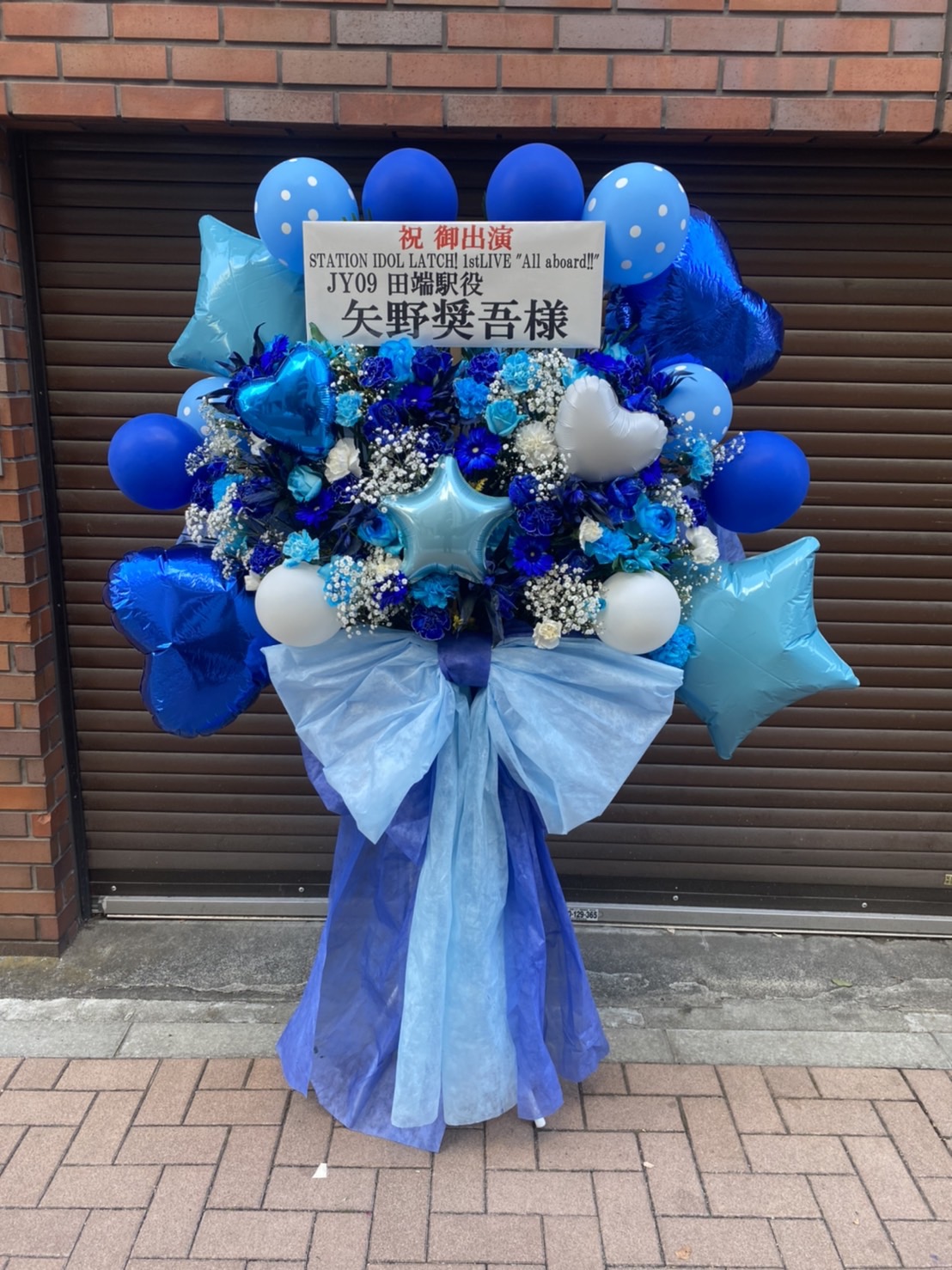 STATION IDOL LATCH!のイベントを祝う、爽やかな青と白のフラスタ。バルーンと生花で華やかに、鉄道旅のような出発を表現しています。