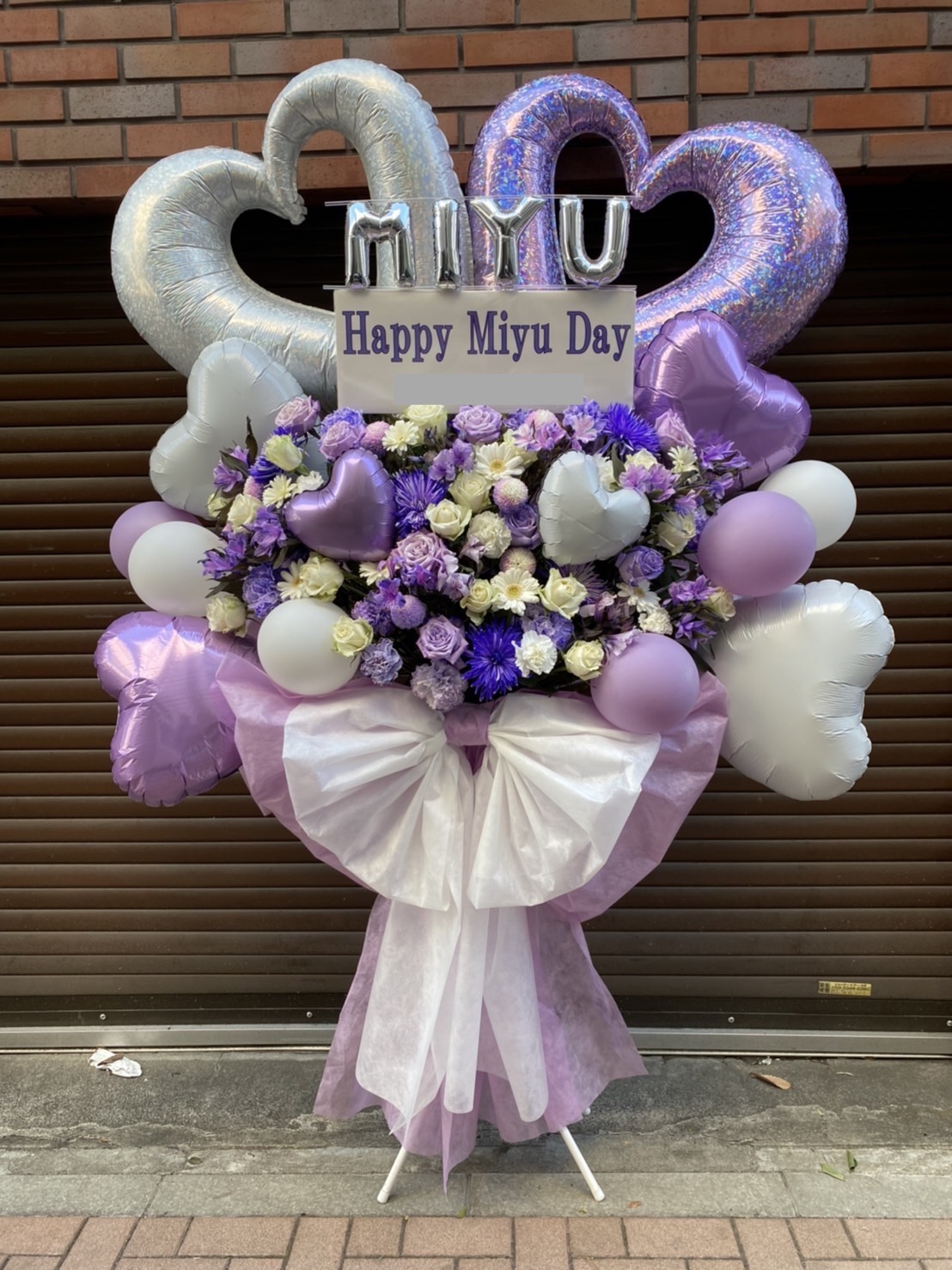 紫と白の生花を基調に、パステルカラーのハートバルーンが彩る華やかなフラスタ。吉井美優さんの生誕祭をお祝いする可愛らしいデザインです。
