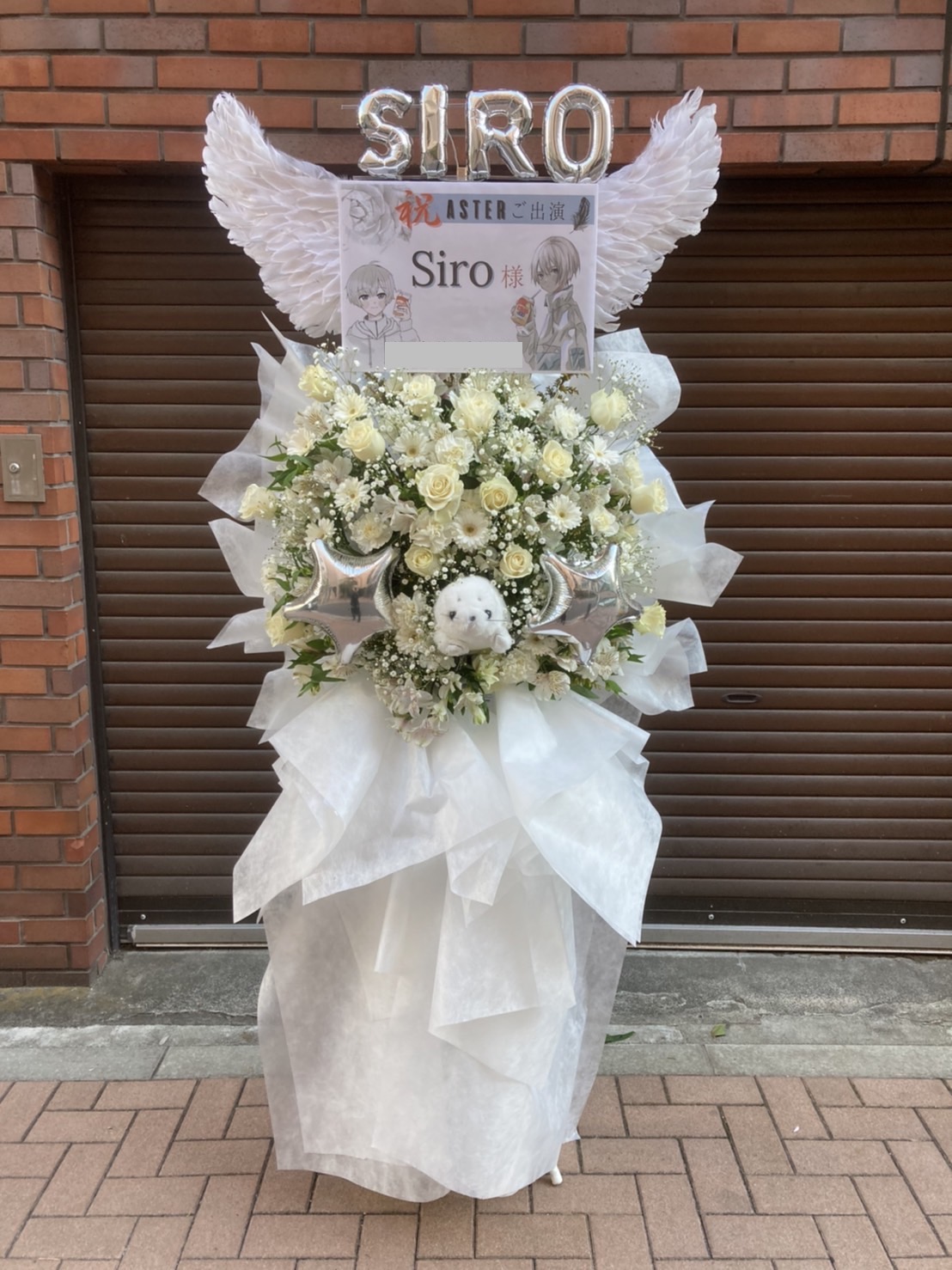 白を基調としたフラスタ。天使の羽と「SIRO」のバルーンで、まるで天使のよう。星形バルーンやアザラシも可愛らしく、華やかに出演をお祝い。