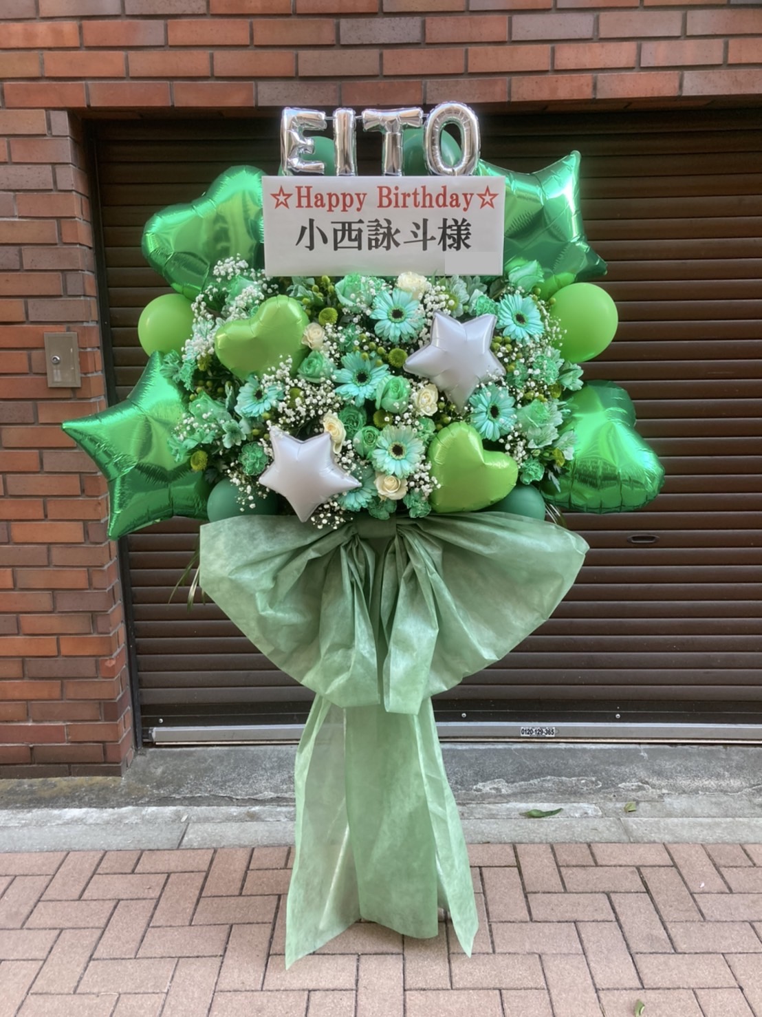 小西詠斗様の生誕祭に贈られた、グリーンがテーマの華やかフラスタ。爽やかな生花とバルーンが祝福ムードを演出します。