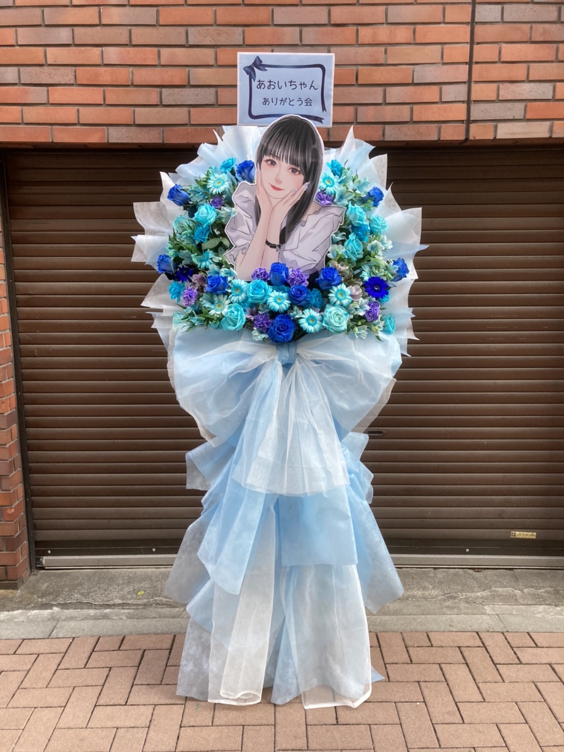 「あおいちゃん今までありがとう会」を彩る、青と白を基調とした華やかなフラスタ。美しい生花とイラストパネルで感謝の気持ちを表現しています。