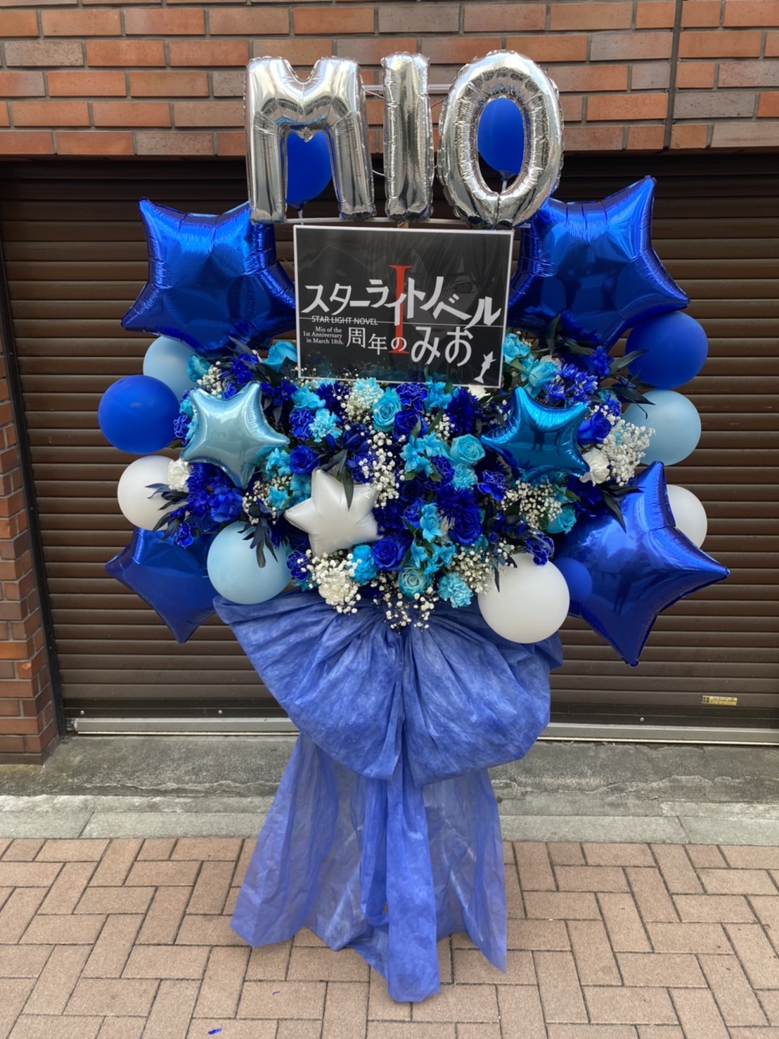 みお1周年をお祝いする、青と白を基調とした爽やかなフラスタ。MIOバルーンと煌めく星、生花が華やかです。