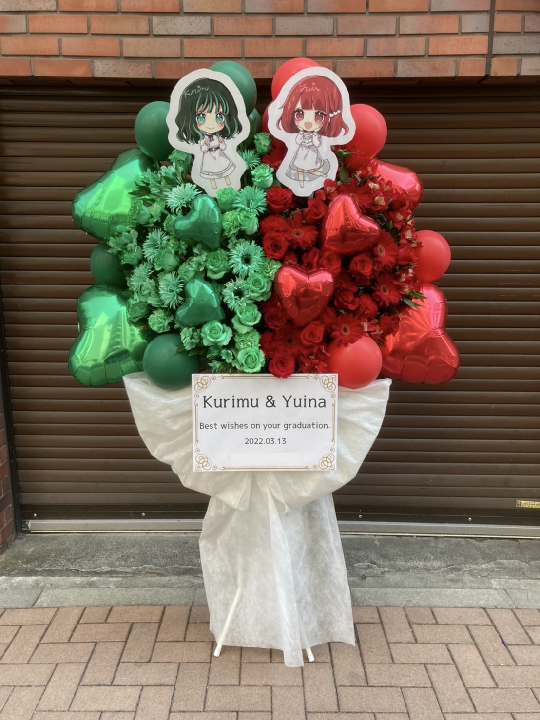 神月紅璃夢さん&凪ユイナさんの卒業ライブに贈られた、緑と赤のバイカラーが鮮やかなフラスタ。バルーンと生花で華やかに彩り、二人の門出を祝福するデザインです。