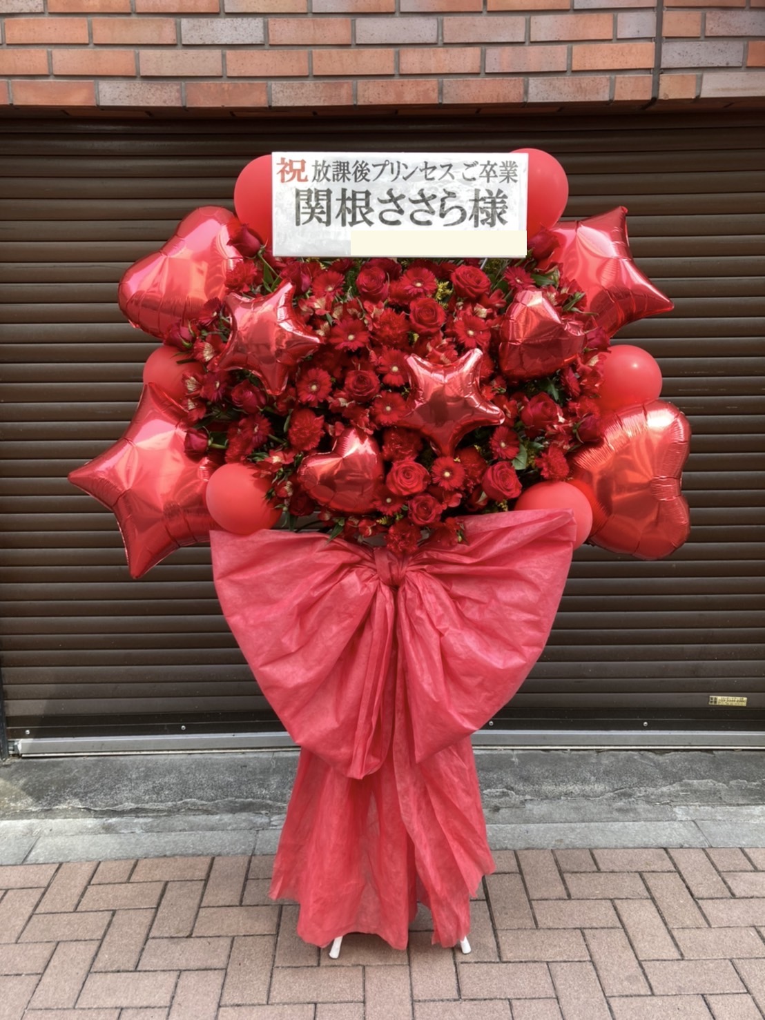 赤一色でまとめられた豪華なフラスタ。バルーンと生花が織りなす華やかなデザインは、卒業をお祝いするのにぴったりです。