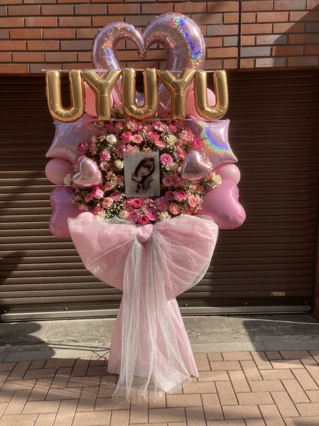 うゆゆ様バースデーをお祝いする、ピンクとゴールドが華やかなフラスタ。バルーンと生花で可愛らしい雰囲気に。