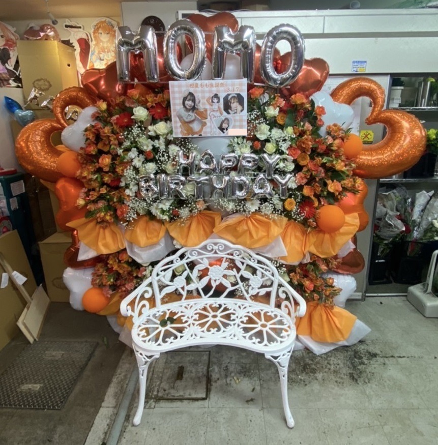 白とオレンジを基調とした、華やかで可愛らしいフラワースタンド。生花とバルーンで明るいお祝いムードを演出しています。