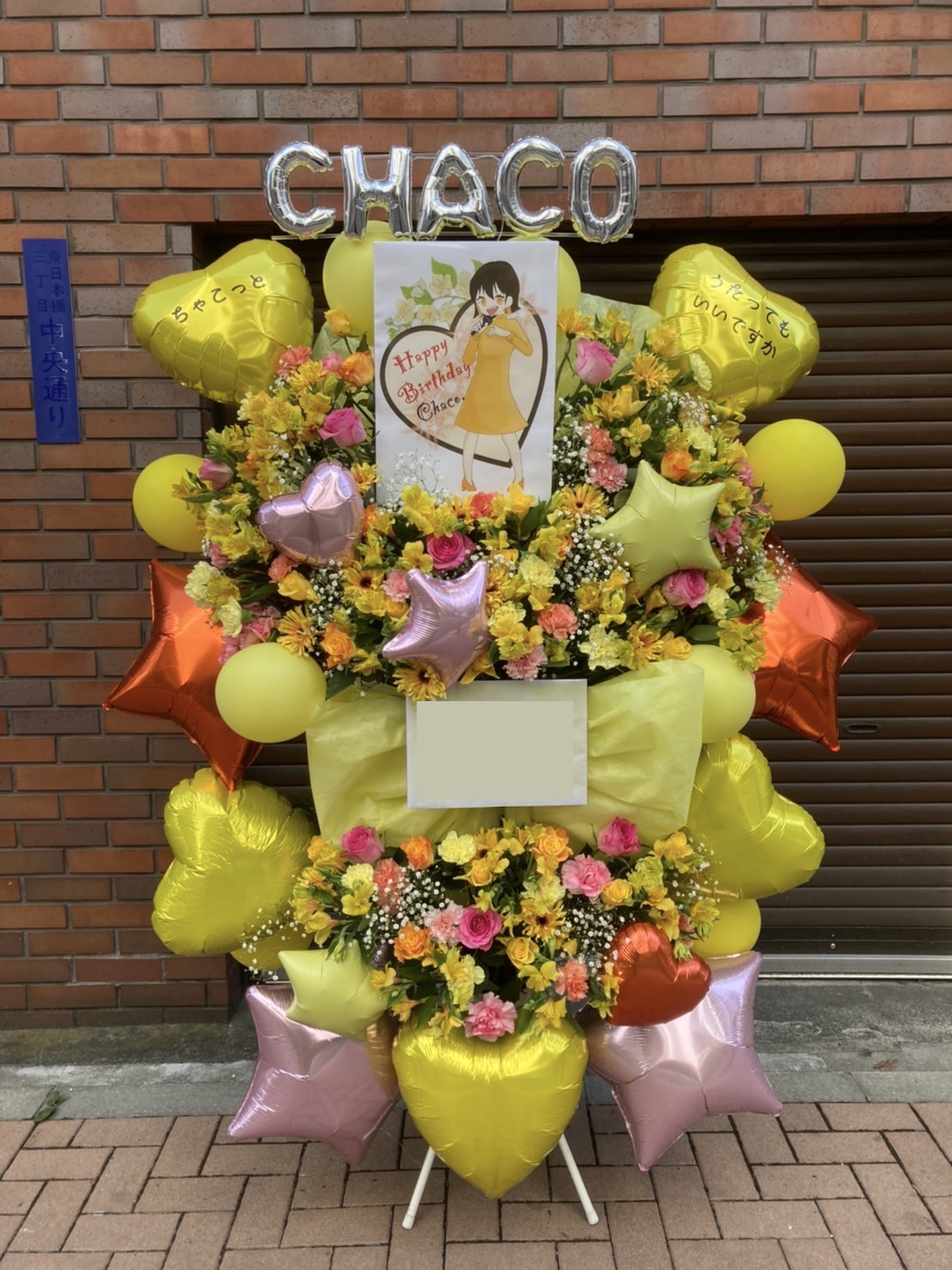 黄色とピンクのバルーン&生花が華やか!可愛いイラストパネルと合わせて、誕生日のお祝いにぴったりのフラスタです。