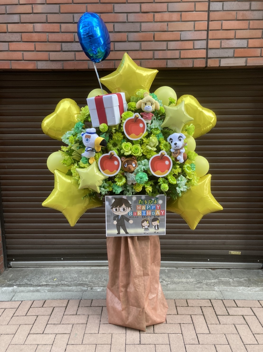 黄色と緑を基調に、どうぶつの森キャラクターとバルーンで賑やかに飾られたフラスタ。明るく楽しい聖誕祭の雰囲気を演出しています。