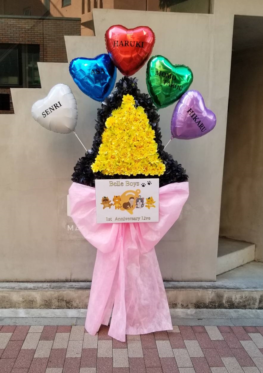Belle Boysワンマンライブを彩る、鮮やかな黄色と黒のフラスタ。ピンクのリボンとカラフルなハートバルーンが、華やかで可愛らしい雰囲気を演出しています。