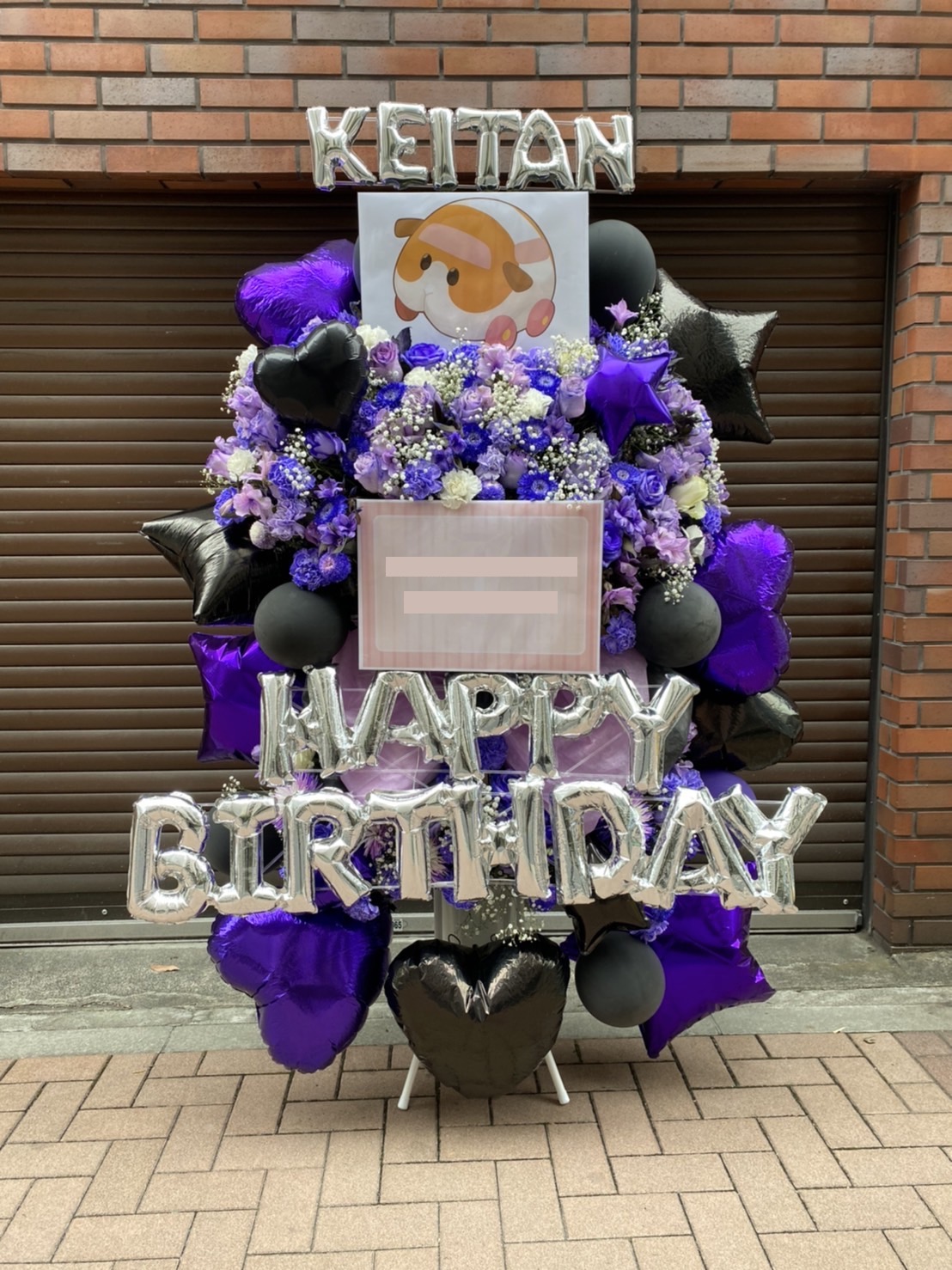 紫と黒を基調とした、大人可愛いバースデーフラスタ。キュートなキャラクターパネルが目を引きます。