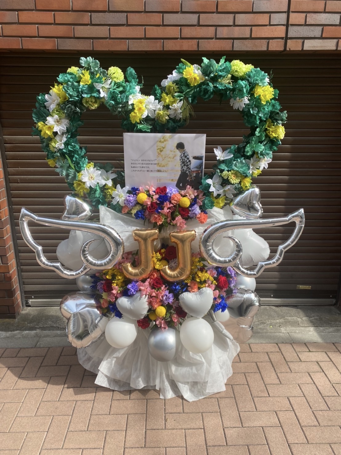 J-JUN THURSDAY PARTYへ贈られた、ハートと翼が特徴的なフラスタ。緑と黄色のリース、鮮やかな多色使いの花々、シルバーのバルーンが華やかで可愛らしいデザインです。