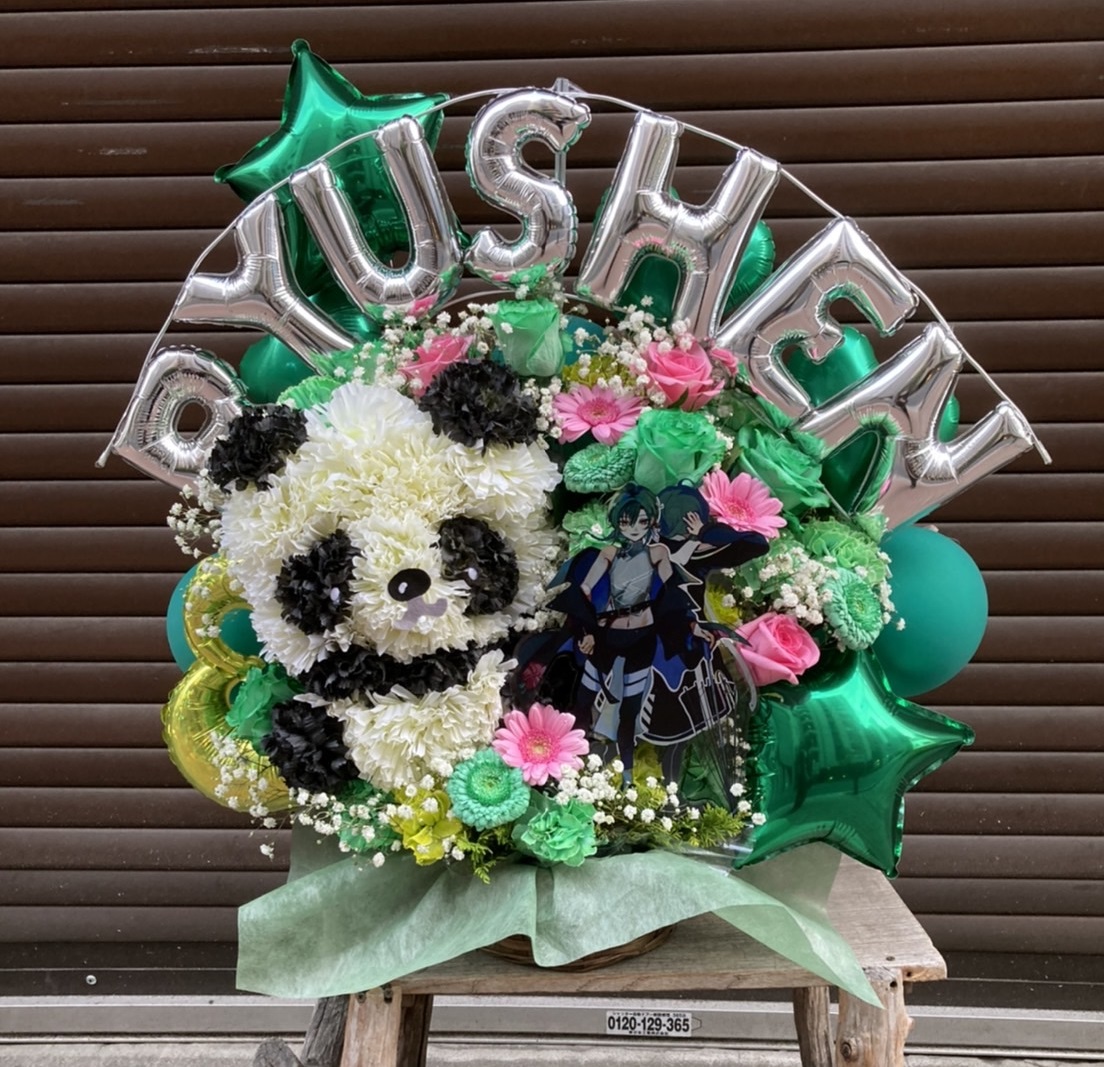緑と白を基調に、可愛らしいパンダの生花アレンジが目を引くフラスタ。ピンクの花がアクセントとなり、華やかながらも温かい雰囲気を演出しています。