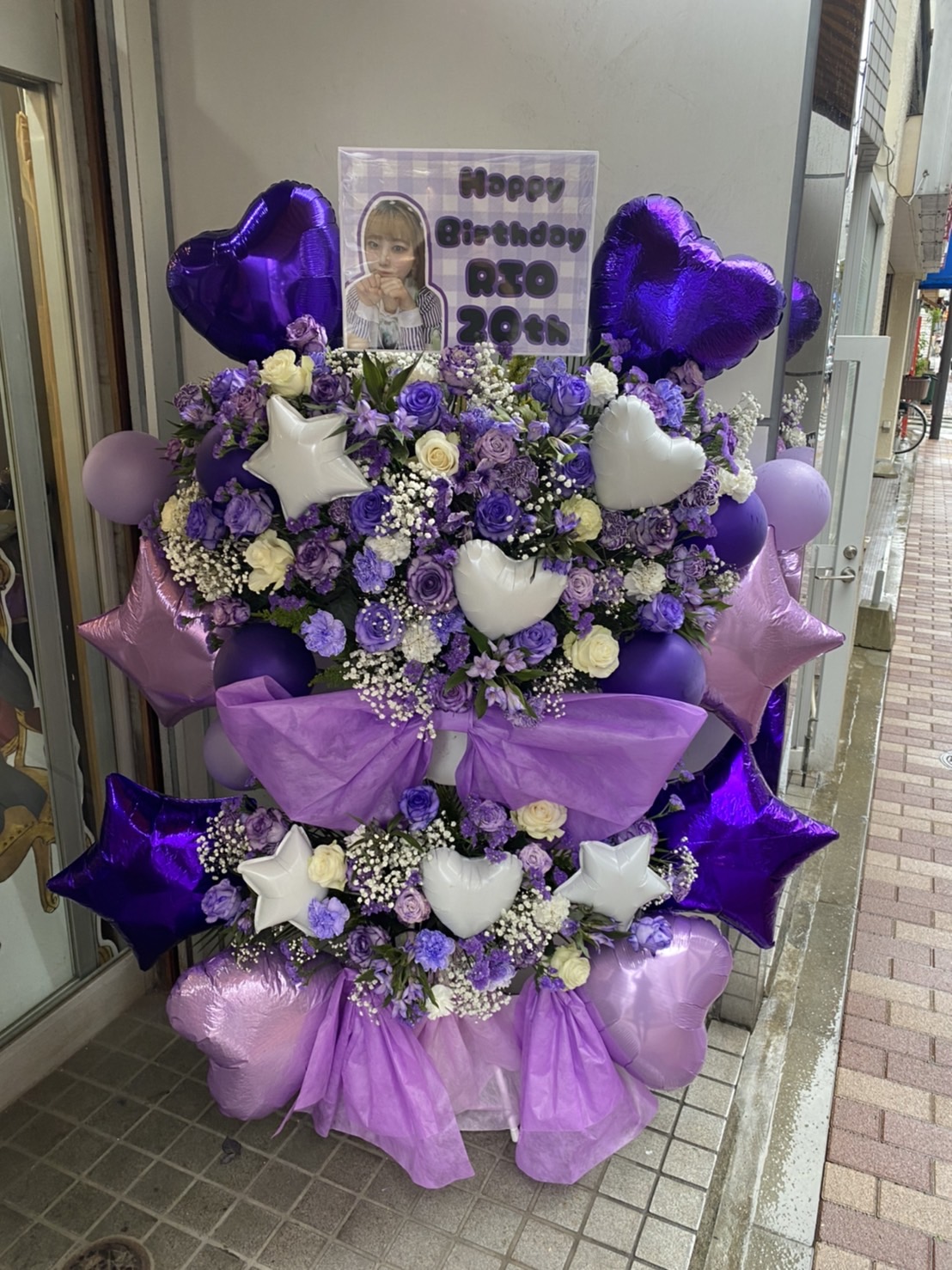 紫と白を基調とした、RIOさん20歳の誕生日を祝う華やかなフラスタ。生花とハートや星のバルーンが可愛らしい雰囲気を演出しています。