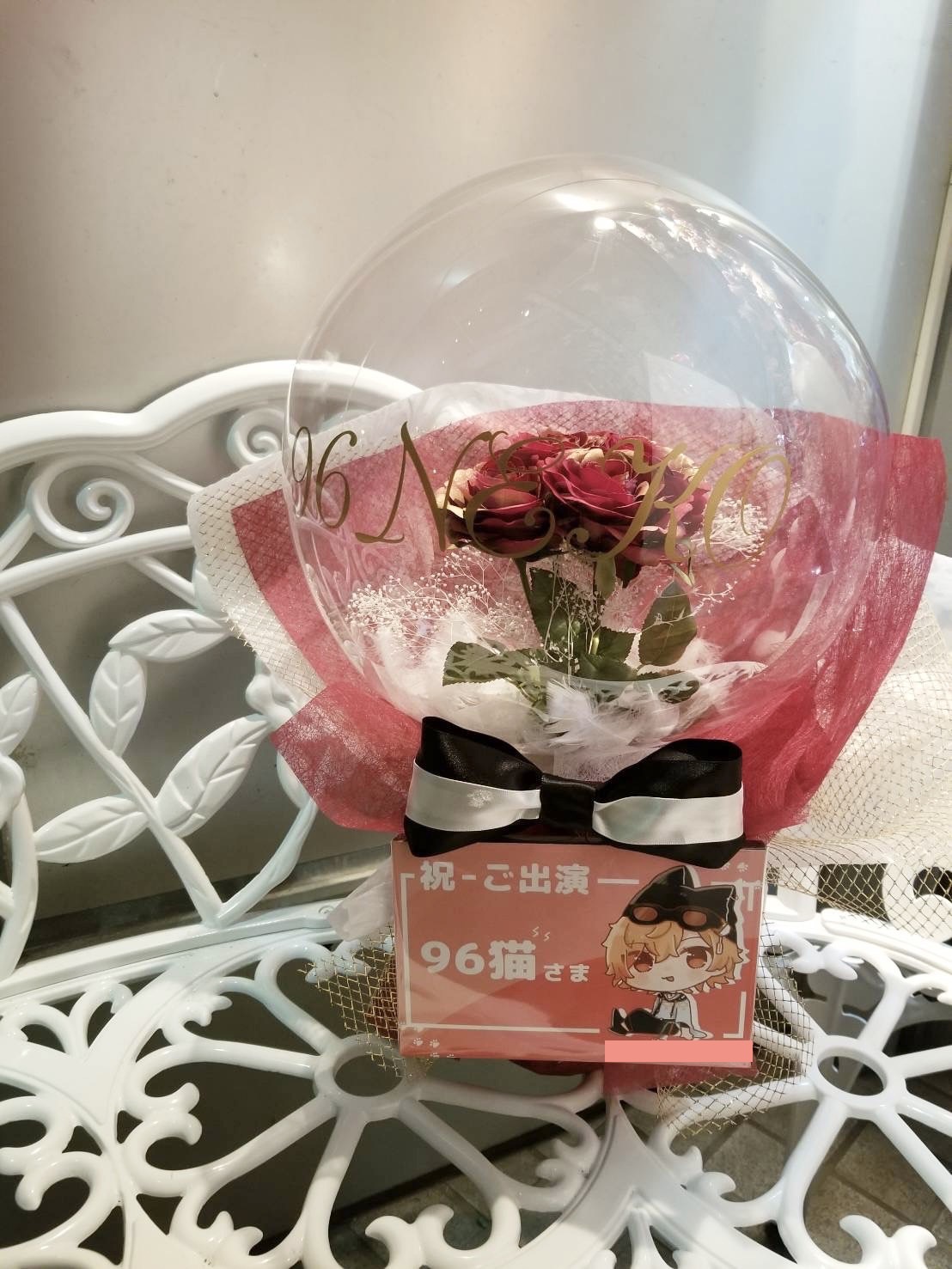 透明バルーンの中に赤と白のバラを閉じ込めた、エレガントなスタンド花です。黒と白のリボンがアクセントになっています。