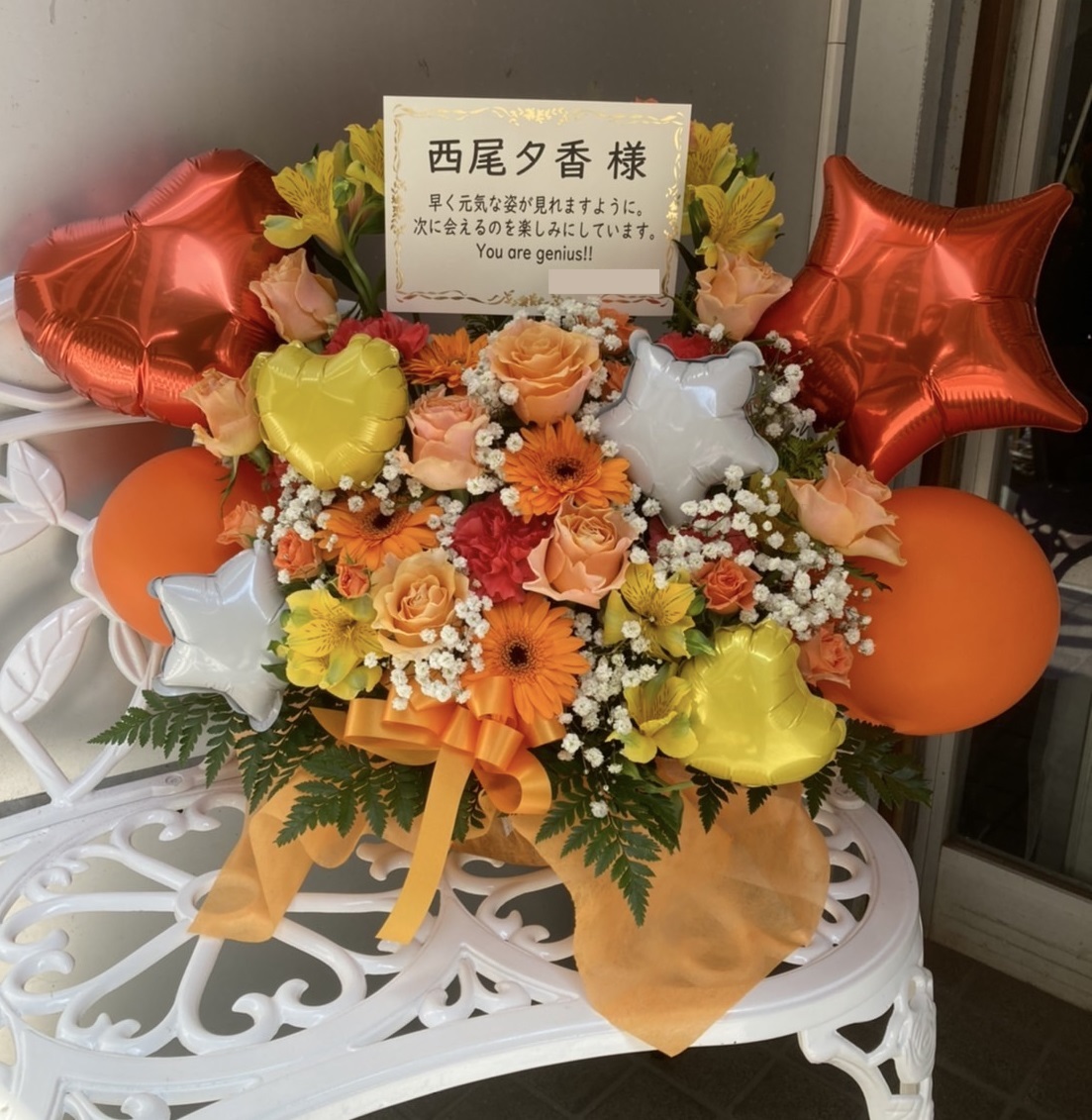 元気いっぱいのオレンジとイエローで彩られたフラスタ。ハートや星のバルーンが可愛い、華やかで明るいデザインです。