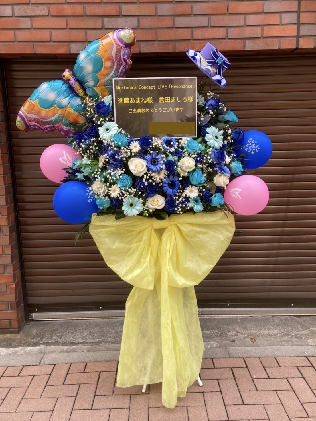青と白を基調とした爽やかなフラスタ。カラフルな蝶々バルーンとピンクのアクセントが華やかさを添え、Morfonicaの世界観を表現しています。
